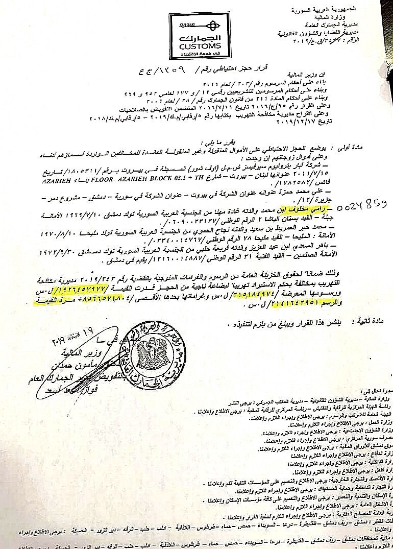 وجاء قرار الحجز، بحسب الجمارك، بسبب تهريب بضاعة ناجية من الحجز، تقدر قيمتها بنحو 1.9 مليار ليرة سورية، يترتب عليها رسوم بقيمة 215 مليون ليرة، ليكون أول قرار رسمي ضد مخلوفالذي يعتبر الذارع الاقتصادية لآل الأسد.
