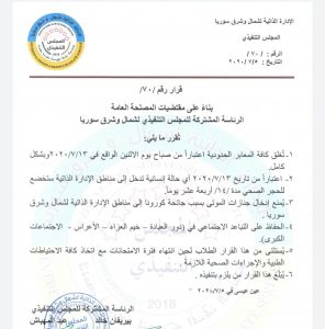 وحسب بيان صادر عن الإدارة، قررت إغلاق كافة المعابر الحدودية اعتباراً من، صباح الاثنين المقبل 13 من يوليو / تموز، بشكل كامل، إضافة إلى إخضاع أي حالة إنسانية تدخل إلى مناطقها للحجر الصحي لمدة 14 يوماً.