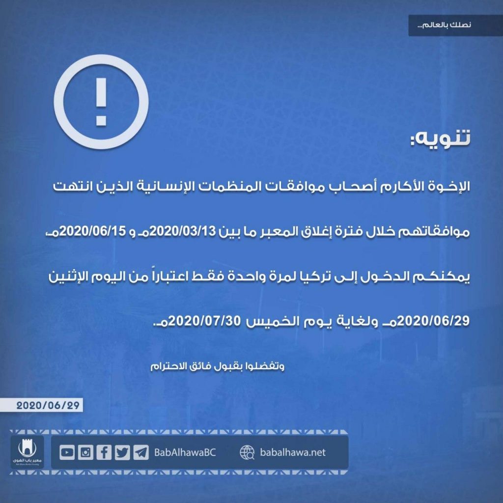 تزامناً مع ذلك، أصدر المعبر بياناً، الأسبوع الماضي، سمح خلاله لأصحاب موافقات المنظمات الإنسانية، الذين انتهت موافقاتهم خلال فترة إغلاق المعبر، ما بين 13مارس/ آذار و15 يونيو/حزيران الماضيين، الدخول إلى تركيا مرة واحدة فقط.