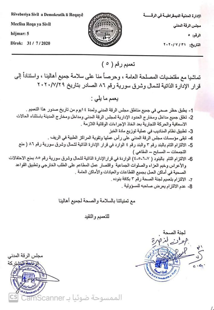 وجاء في التعميم: “تبقى مؤسسات مجلس الرقة على رأس عملها مع تقوية المراكز الطبية في الريف”.