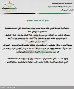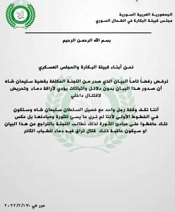 في المقابل، صدرت بيانات باسم عشائر “البكارة” و”الدمالخة” و”النعيم”، و”البني خالد” في الشمال السوري، ترفض قرار اللجنة وتعتبره فتنة.