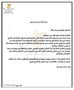 وأعربت البيانات، عن رفضها التام لقرار اللجنة، معتبرين إياه غير مستند لأدلة ويؤدي إلى “فتنة وإراقة الدماء”.