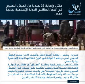 قال تنظيم “الدولة الإسلامية”، اليوم الجمعة، إن هجوماً لعناصره، استهدف حافلةً تقل ضباط من قوات النظام، أدى لمقتل وإصابة 25 منهم، وذلك بعد يومٍ من تأكيد ناشطينَ موالين لنظام الأسد، مقتل 6 ضباط كانوا في الحافلة التي تعرضت للهجوم، قرب منطقة حميمة في بادية حمص الشرقية.