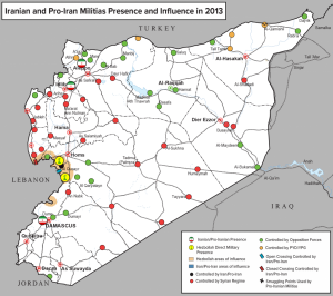 في عام 2013، كان النفوذ العسكري الإيراني غير مباشر ومن خلال وجود جماعة حزب الله اللبنانية المسلحة.
