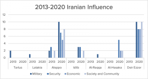 على سبيل المثال، عندما يتعلق الأمر بالسيطرة الاقتصادية، أعادت إيران تنشيط منتدى الأعمال السوري الإيراني في عام 2018، والذي لعب دورًا أساسيًا في انتشار المشاريع الإيرانية في مناطق مختلفة من سورية، مع التركيز في الغالب على مشاريع توليد الطاقة.
