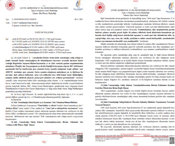 أصدرت مديرية الطابو في وزارة البيئة والمدن التركية، تعميماً بخصوص تملك الأجانب متعددي الجنسية، بمن في ذلك حملة الجنسية السورية.