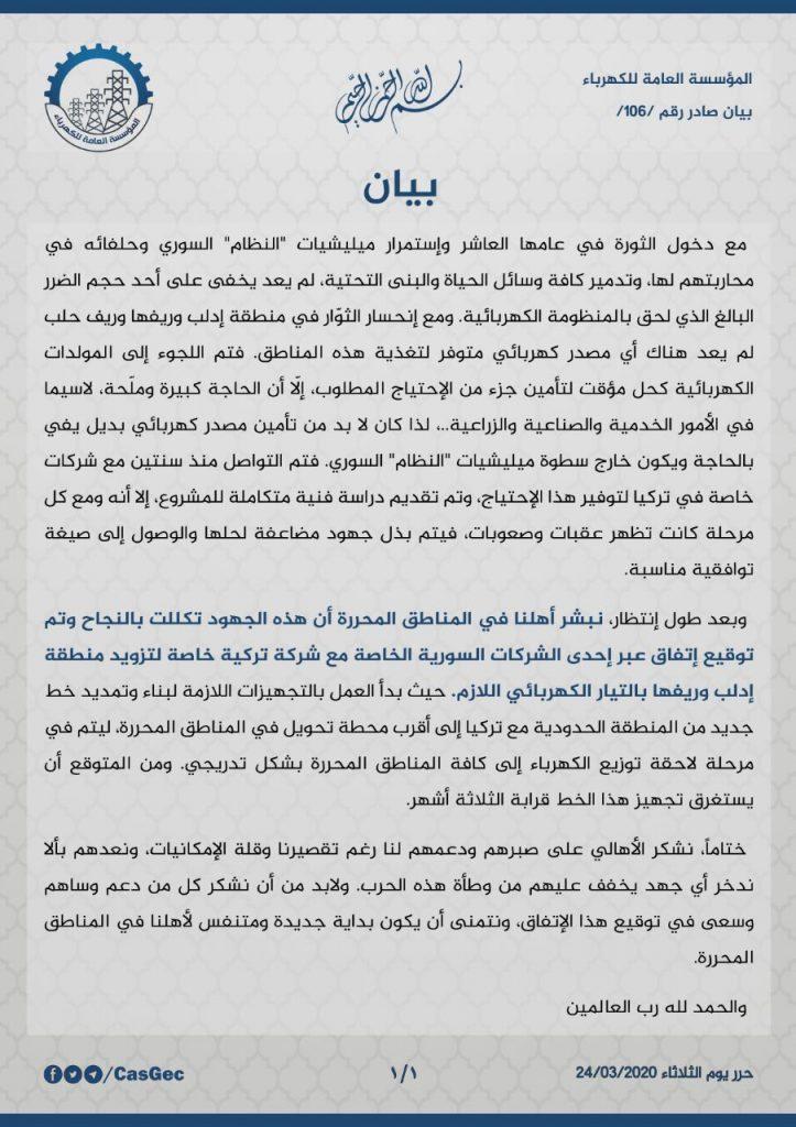 ونشرت “المؤسسة العامة للكهرباء” التابعة لـ”الإنقاذ” بياناً عبر معرفاتها، الثلاثاء 24 من آذار الحالي، قالت فيه إنها وقعت اتفاقاً عبر إحدى الشركات السورية الخاصة مع شركة تركية خاصة، لتزويد محافظة إدلب بالتيار الكهربائي.