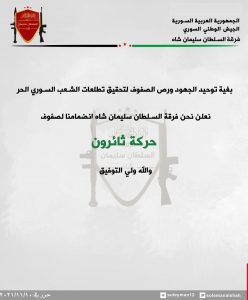 ولم تمض أسابيع قليلة على تشكيل “الجبهة السورية للتحرير” حتى انسحبت “فرقة سليمان شاه” منها، وإعلان انضمامها، أمس، إلى “حركة ثائرون” إحدى تشكيلات غرفة القيادة الموحدة “عزم”.