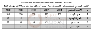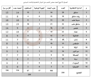 بعد تأجيلها لمرتين متتاليتين بسبب جائحة كورونا، تم إجراء انتخابات أعضاء “مجلس الشعب”، ليتم لاحقاً إعلان أسماء الناجحين بعضوية المجلس بالمرسوم رقم /208/ لعام 2020، حيث تضمنت قائمة الناجحين أسماء /166/ عضو عن حزب البعث الحاكم بنسبة 66.4% و/17/ عضواً يمثلون أحزاب الجبهة الوطنية التقدمية (عدا حزب البعث) بنسبة 6.8%، أما المستقلين فقد بلغ عددهم /67/ عضو بنسبة 26.8%، علماً أن من بين هؤلاء الأعضاء هناك /114/ عضو يتواجدون في المجلس للمرة الثانية على الأقل، أي أن المجلس يكرر نفسه بنسبة 45.6%، حيث يتوزع أعضاء مجلس الشعب على الدوائر الانتخابية تبعاً للمحافظات والانتماء السياسي كما يلي: