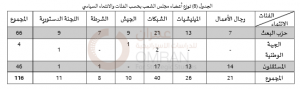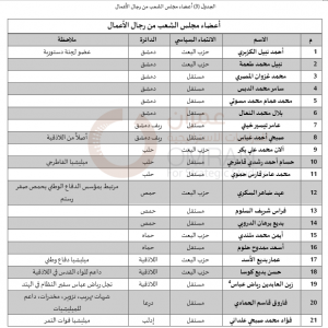 ودخل المجلس في الدورة الحالية، 21 عضواً من “رجال الأعمال”؛ و 26 عضو من قادة الميليشيات وممثليها؛ و40 عضو من الشبكات المرتبطة بالأجهزة الأمنية؛ و18 عضو من متقاعدي وزارتي الدفاع والداخلية؛ و11 عضو من أعضاء اللجنة الدستورية.