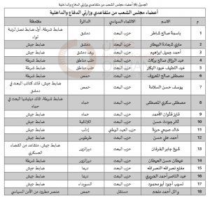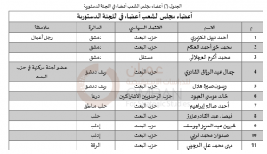 كما احتفظ أيضاً /11/ عضواً من أعضاء اللجنة الدستورية عن النظام السوري بمقاعدهم في مجلس الشعب، /9/ منهم من أعضاء حزب البعث الحاكم، وواحد عن أحد أحزاب الجبهة الوطنية، والعضو الأخير مستقل، وتأتي إعادة ترشيحهم من أجل إرساء المزيد من “الشرعية” باعتبار أنهم أعضاء في مجلس الشعب، وهم: