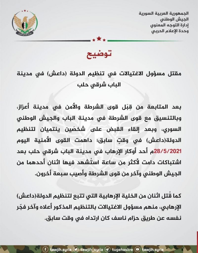 أعلن “الجيش الوطني السوري” العامل في ريف حلب الشمالي مقتل “مسؤول الاغتيالات” في تنظيم “الدولة الإسلامية”، بعد عملية مداهمة نفذتها فصائله في مدينة الباب.