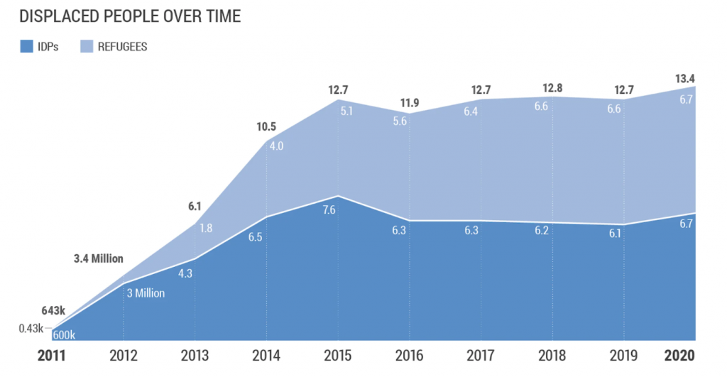 وهناك 7 ملايين سوري إضافي نازحون داخلياً، وهم أكبر عدد من النازحين داخلياً في العالم.
