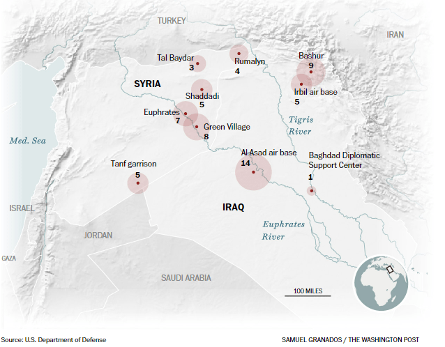 وتظهر بيانات وزارة الدفاع الأمريكية التي حصلت عليها صحيفة واشنطن بوست أن الهجمات استهدفت 10 قواعد يستخدمها أفراد أمريكيون منتشرين في كلا البلدين.