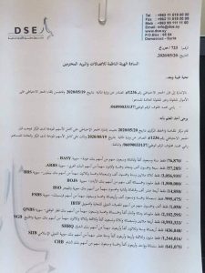 واطلعت “السورية. نت” على وثيقة، نشرت على مواقع التواصل الاجتماعي، لم يتحقق من صحتها، تؤكد وضع إشارة الحجز الاحتياطي على كامل الأسهم المودعة لدى “مركز المقاصة والحفظ المركزي” (التابعة لسوق دمشق للأوراق المالية)، العائدة لرامي مخلوف.