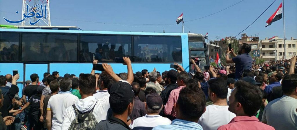 وعرضت شبكات موالية لنظام الأسد صوراً للمعتقلين في أثناء وصولهم إلى دوما، وكانوا يحملون صور بشار الأسد ومحاطين بعناصر ومسؤولين أمنيين وآخرين من “حزب البعث”.