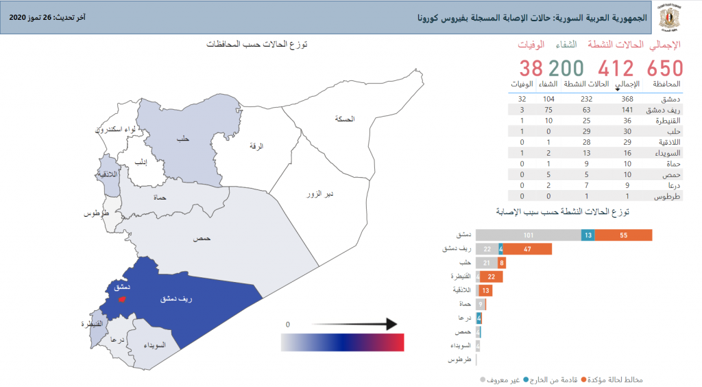 وبحسب بيانات “وزارة الصحة” في حكومة الأسد، فإن إجمالي الإصابات بالفيروس حتى الآن بلغت 650 إصابة، و38 وفاة.