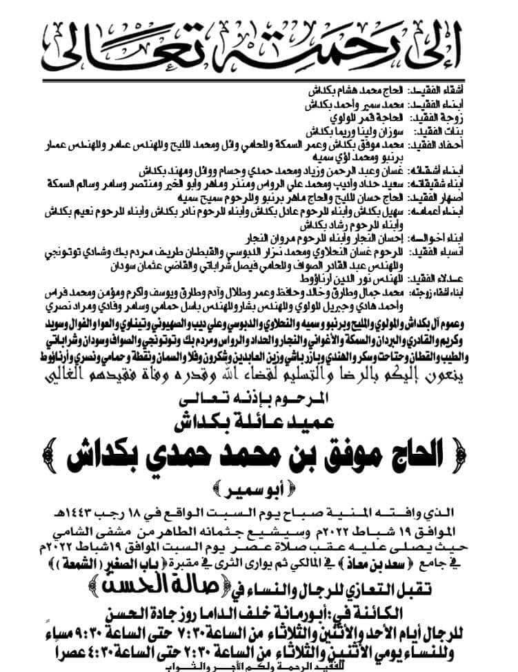ونعى مقربون منه والصفحة الرسمية لـ”بوظة بكداش” عبر “فيس بوك“، اليوم السبت “الحاج موفق”، وقالوا إنه توفي مع ساعات الصباح.