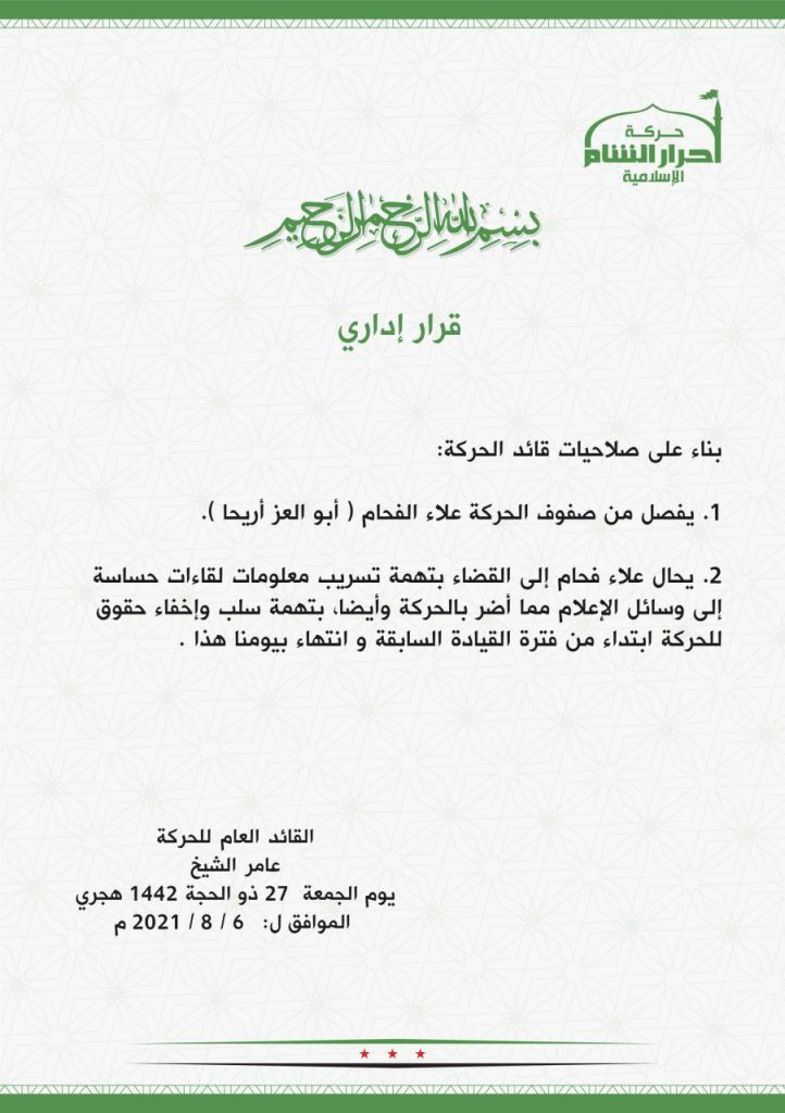 وجاء في القرار الداخلي الذي حصلت “السورية.نت” على نسخة منه، اليوم السبت: “يفصل من صفوف الحركة علاء فحام أبو العز أريحا، ويحال إلى القضاء بتهمة تسريب معلومات ولقاءات حساسة لوسائل الإعلام”.