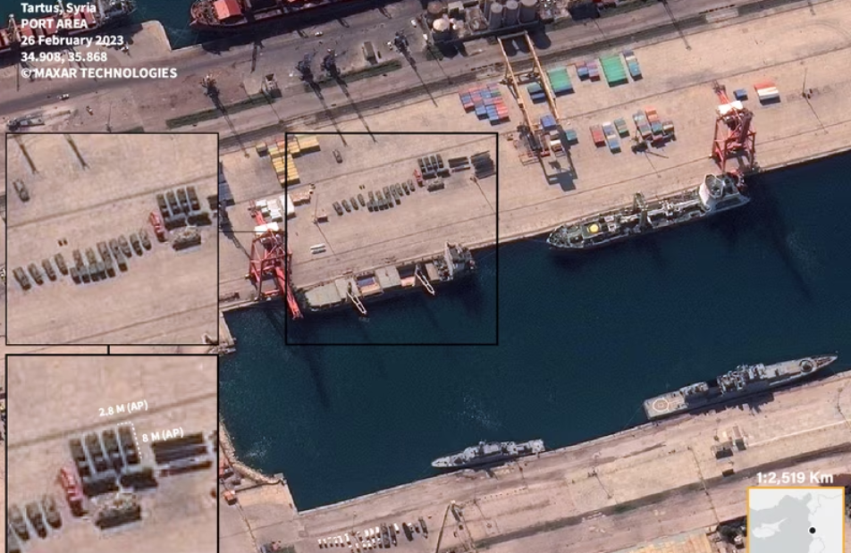 وتظهر صور الأقمار الصناعية الصادرة عن “مركز الدراسات الاستراتيجية والدولية” أنه يتم تحميل عدد كبير من قطع المدفعية على السفينة عند رسوها في طرطوس.