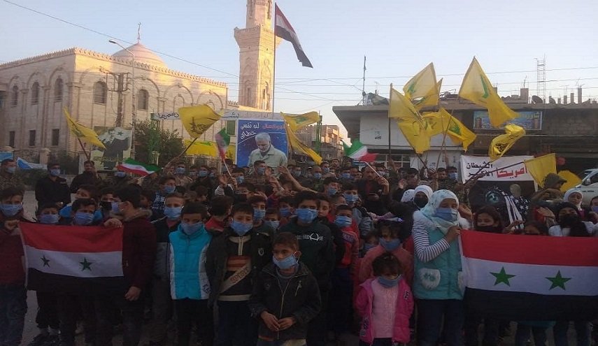 وتظهر الصور رفع أعلام “حزب الله” اللبناني وميليشيا “فاطميون” الإيرانية، إلى جانب صورة قائد “فيلق القدس” السابق، قاسم سليماني، الذي قتل مطلع العام الحالي بقصف أمريكي في العراق.