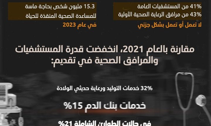 وكان مكتب الأمم المتحدة لتنسيق الشؤون الإنسانية “أوتشا”، قال في أحدث إحصائياته حول القطاع الطبي في سورية إن 41% من المستشفيات العامة و43% من مرافق الرعاية الصحية الأولية، لا تعمل أو تعمل بشكل جزئي.