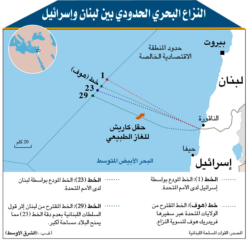 سنة 2011 حدد لبنان وفق مرسوم المنطقة الاقتصادية الخالصة بشكل منفرد، وأرسل الإحداثيات إلى الأمم المتحدة لكن إسرائيل اعترضت عليها.
