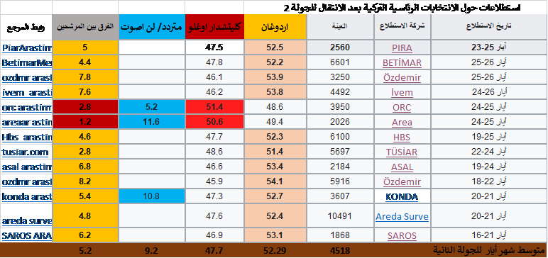 - فيما يلي جدول استطلاعات الراي التي أجرتها شركات استطلاعات الراي التركية بعد الانتقال للجولة الثانية المقرر إجرائها اليوم 28 أيار 2023: