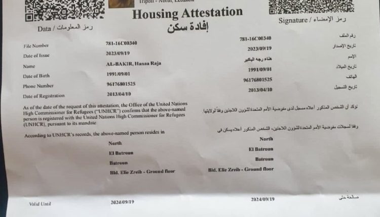 وفق ما رصدت “السورية نت” على موقع مفوضية اللاجئين فإن المفوضية “تصدر إفادات سكن للاجئين يحدّد فيها مكان إقامتهم الحالية في لبنان ومعلومات أساسية”.