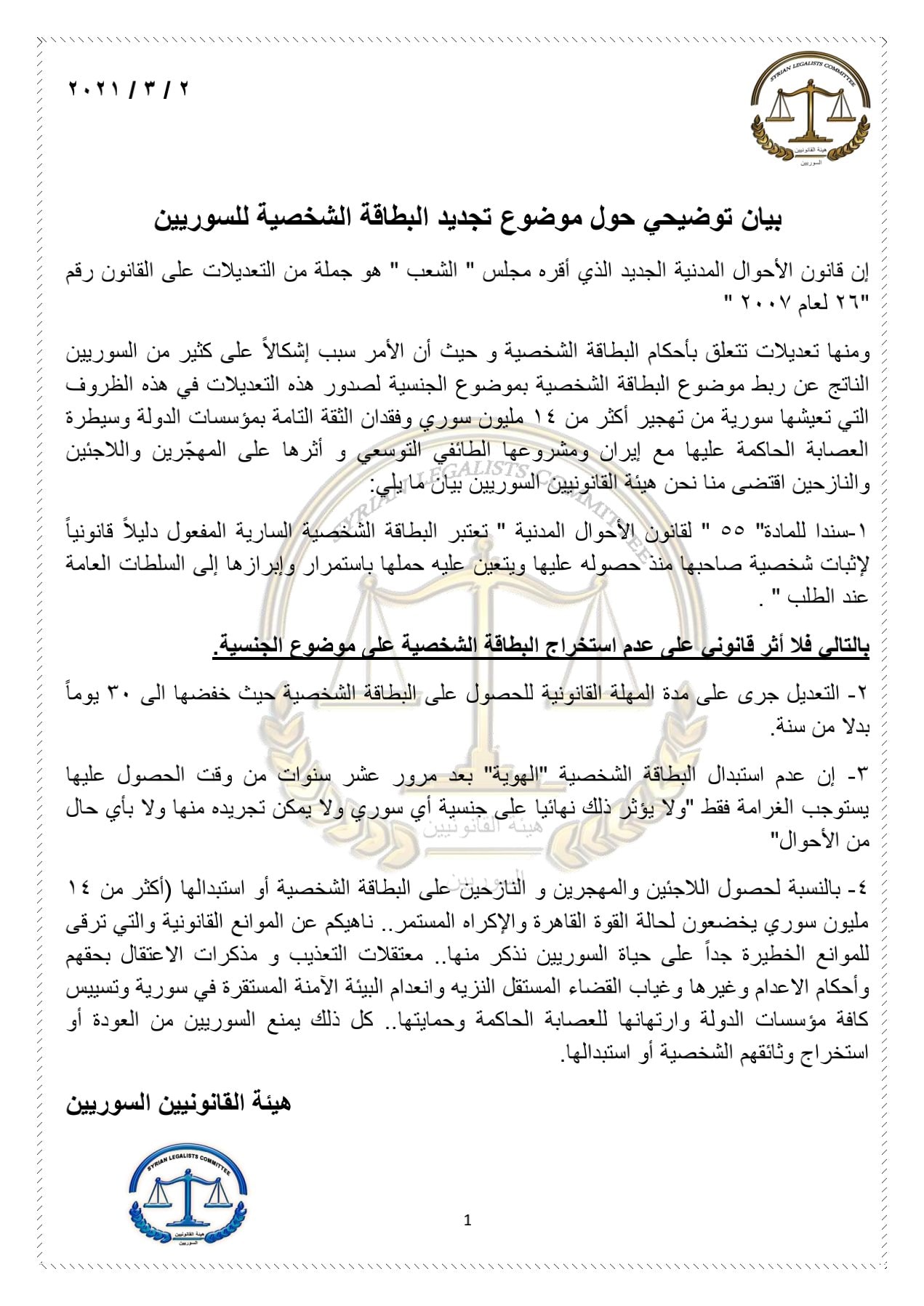 إلا أن “هيئة القانونيين السوريين” أوضحت في بيان لها أنه “لا أثر قانوني على عدم استخراج البطاقة الشخصية على موضوع الجنسية”.
