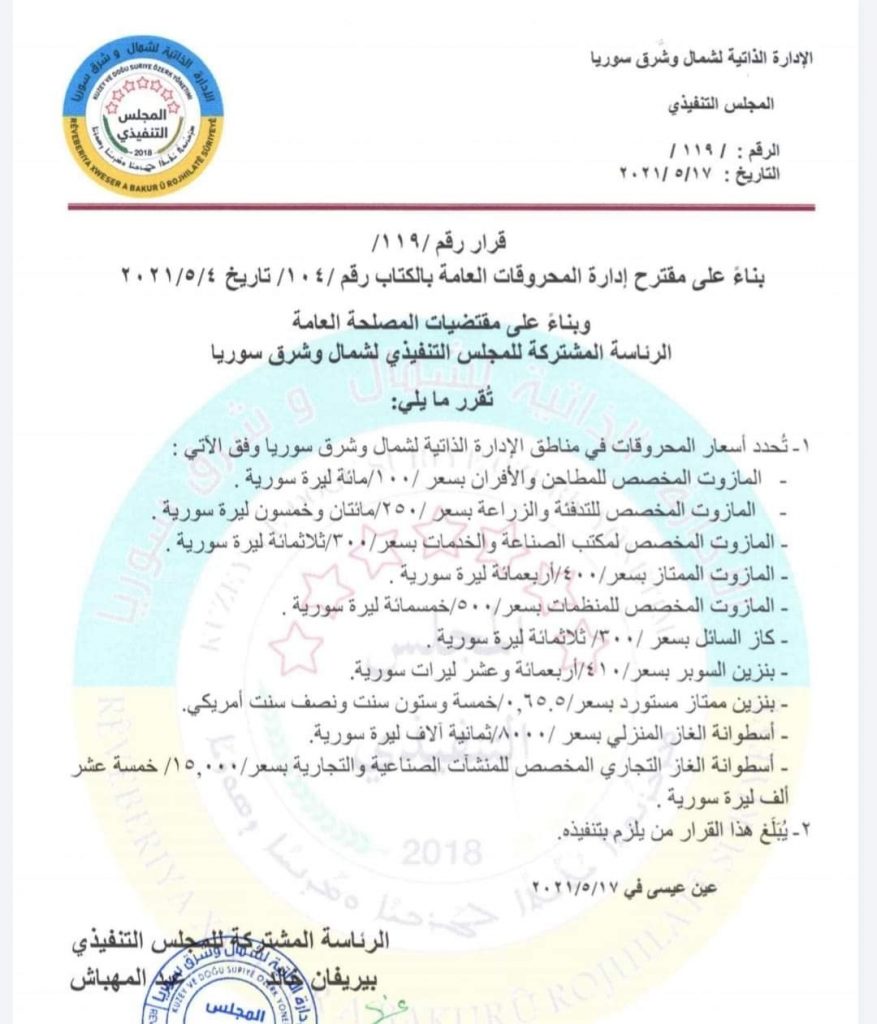 ولم تكشف “الإدارة الذاتية” عن الأسباب التي دفعت إلى رفع أسعار هذه المواد، وقالت ضمن القرار إنه يأتي “بناء على مقتضيات المصلحة العامة”.