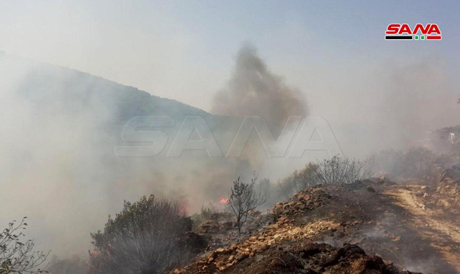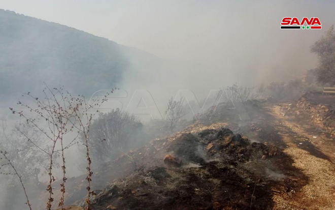 وحسب “سانا”، فإن “سرعة الرياح الشرقية الجافة التي وصلت إلى نحو 70 كم في الساعة ولا سيما في بللوران أسهمت بامتداد النيران، وصعوبة السيطرة عليها، إضافة إلى وعورة التضاريس الجبلية”.