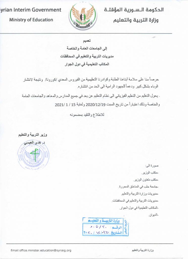 وأصدرت وزارة التربية والتعليم في “الحكومة المؤقتة” قراراً، اليوم الأربعاء، قالت فيه إنه نتيجة لانتشار الوباء بشكل كبير ودعماً للجهود الرامية للحد من انتشاره يُحوّل التعليم من الفيزيائي، إلى نظام التعليم عن بعد في جميع المدارس والمعاهد والجامعات العامة والخاصة.