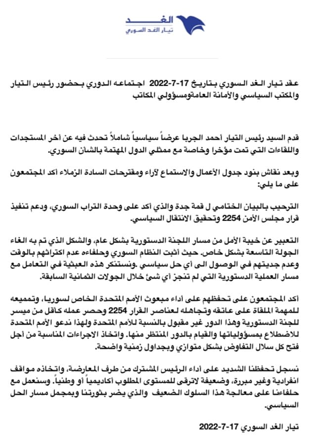 أبدى “تيار الغد السوري” الذي يتزعمه رئيس الائتلاف المعارض الأسبق، أحمد الجربا تحفظه على مسار “اللجنة الدستورية السورية”، وأداء الرئيس المشارك عن وفد المعارضة، هادي البحرة.
