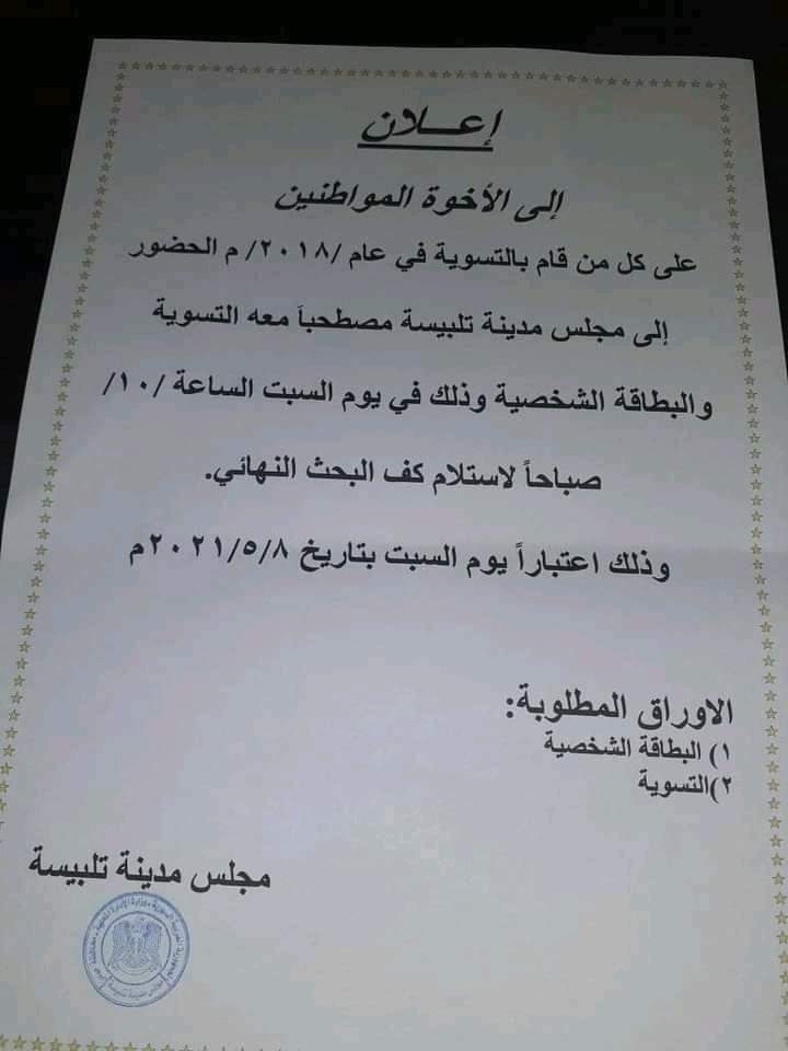 وقال مصدر إعلامي من ريف حمص لـ”السورية.نت”، اليوم الجمعة إن “مجلس بلدية تلبيسة” عمم بضرورة توجه الشبان إلى مقره، اعتباراً من يوم غد السبت، من أجل استلام “كف البحث”.