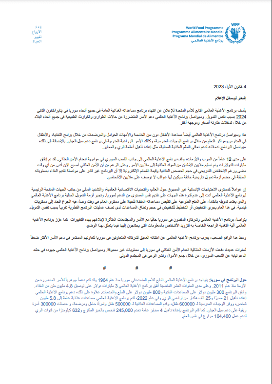 ورغم إعلان إيقاف برنامج المساعدات أشار “الغذاء العالمي” إلى أنه يتواصل مع الأسر والمجتمعات المتأثرة في سورية لإبلاغهم بالتغييرات.