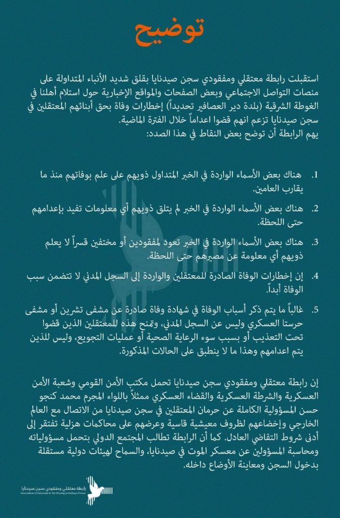 لكن “رابطة معتقلي ومفقودي سجن صيدنايا” نشرت بياناً أوضحت فيه المعلومات التي ترددت سابقاً.