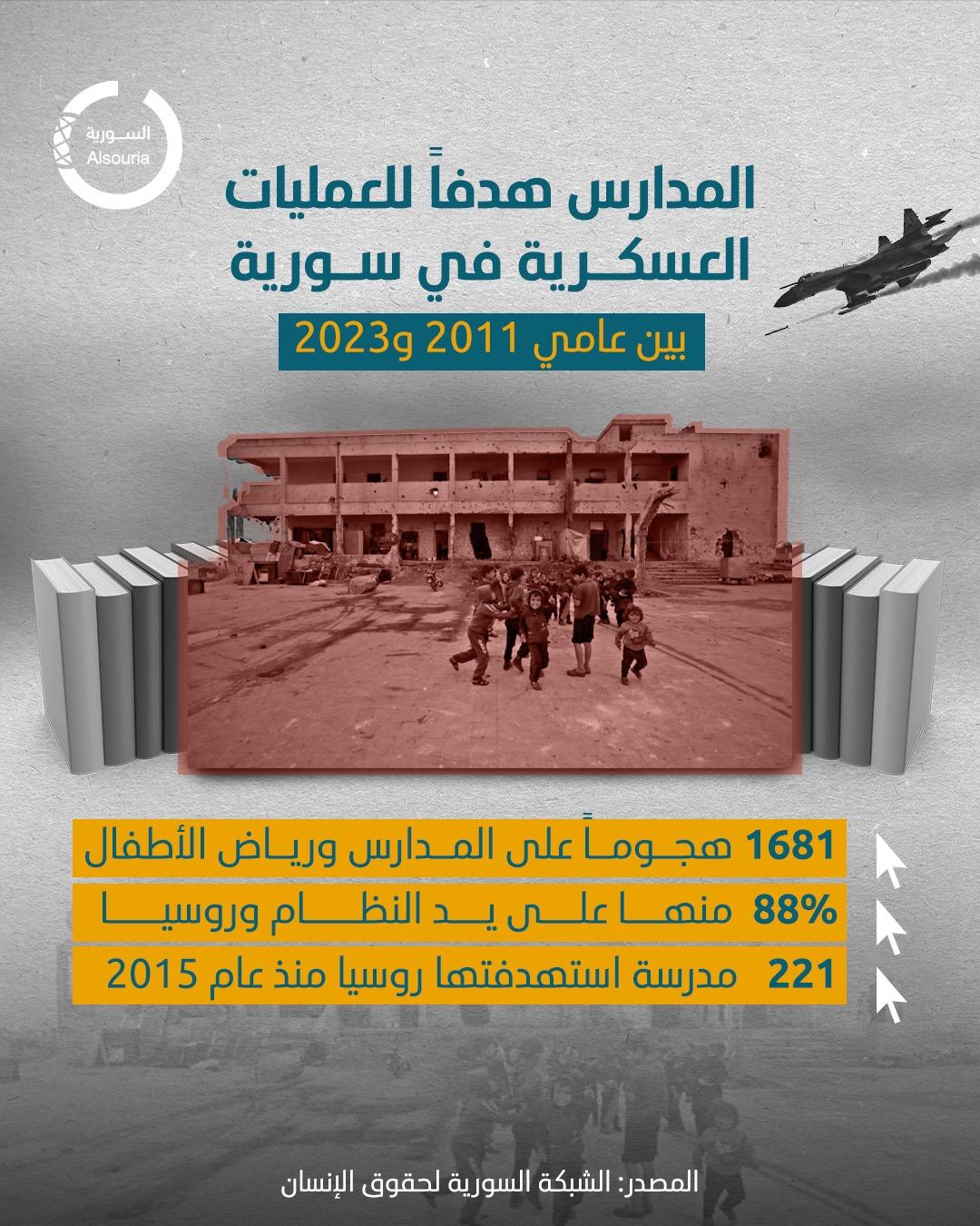 من جانبها، وثقت “الشبكة السورية لحقوق الإنسان” هجمات على 1681 من المدارس ورياض الأطفال والمراكز التعليمية في سورية، منذ عام 2011 وحتى أواخر 2023.