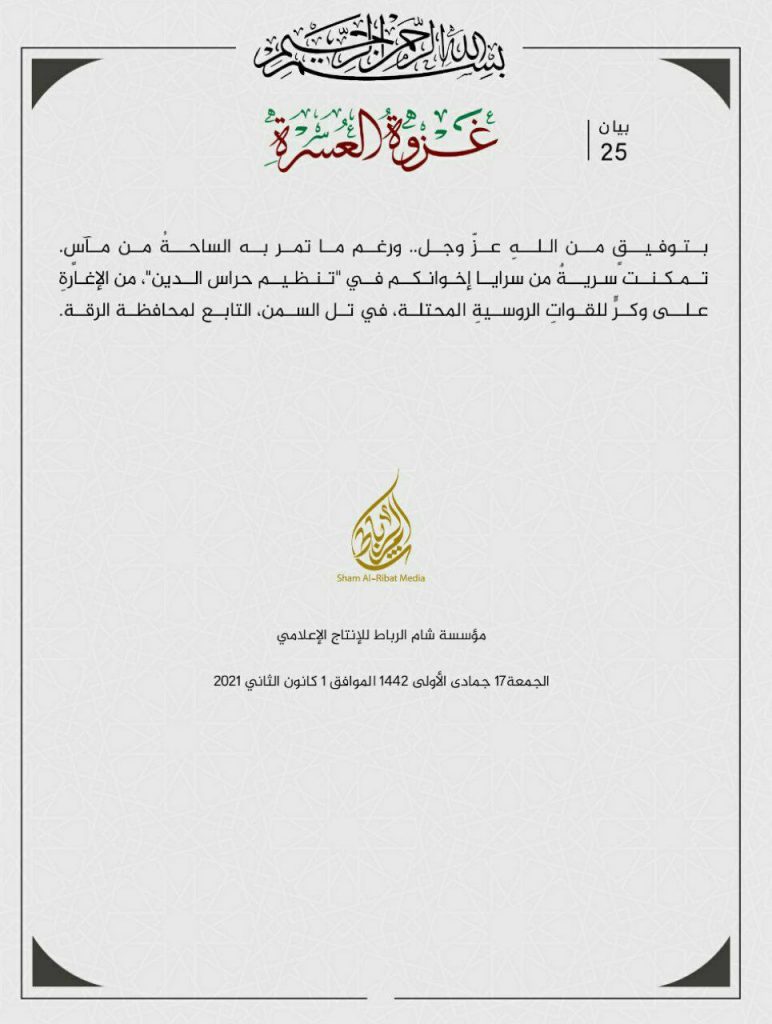 ونشر “حراس الدين” بياناً عبر معرفاته، اليوم الجمعة، قال فيه: “رغم ما تمر به الساحة من مآس تمكنت سرية من سرايا إخوانكم في تنظيم حراس الدين من الإغارة على وكر للقوات الروسية في تل السمن التابع لمحافظة الرقة”.