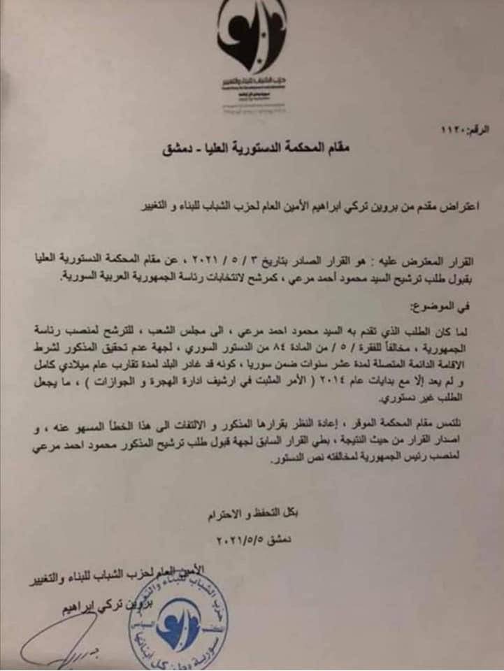 وقالت إبراهيم في طلبها إن المدعو مرعي مخالف للمادة “84” من الدستور، والتي تشترط على المرشح لانتخابات الرئاسة أن يكون مقيماً إقامة دائمة متصلة لمدة عشر سنوات داخل سورية.
