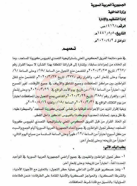 أصدرت حكومة الأسد قراراً يقضي بمنع التجول في جميع المناطق الخاضعة لسيطرته، يومي الجمعة والسبت من كل أسبوع، حتى إشعار آخر.
