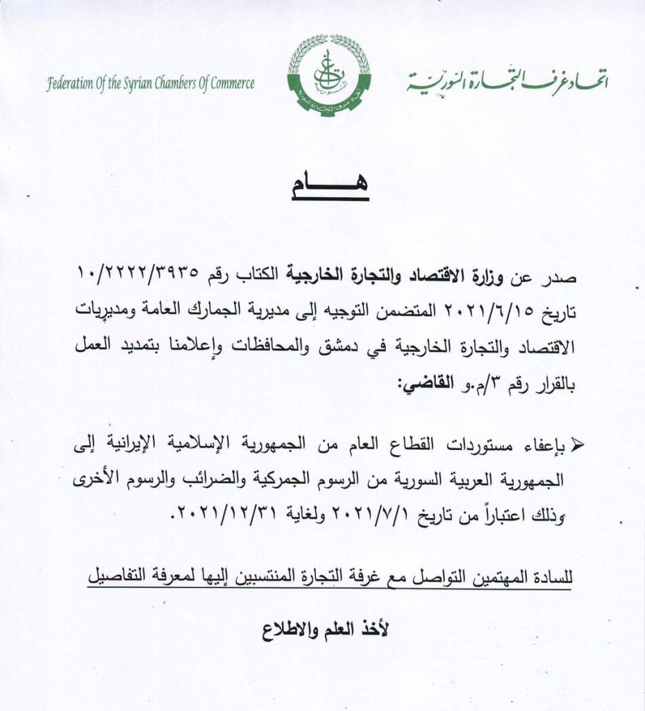 ونشر الاتحاد بياناً عبر “فيس بوك” مدد فيه إعفاء مستوردات القطاع العام القادمة من إيران إلى سورية من الرسوم الجمركية، مشيراً إلى أن ذلك سيكون اعتباراً من بداية يوليو/تموز المقبل وحتى أواخر العام الحالي.
