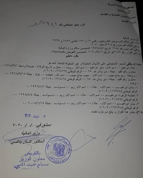 وبحسب القرار رقم “2941” الموقّع من قبل وزير المالية كنان ياغي، اليوم الخميس، يُلقى الحجز الاحتياطي على الأموال المنقولة وغير المنقولة العائدة لعلاء إبراهيم وزوجته ريم حاج نجيب (ابنة خالة بشار الأسد)، وأولاده باسل وبشار وفاطمة الزهراء، دون توضيح سبب الحجز.