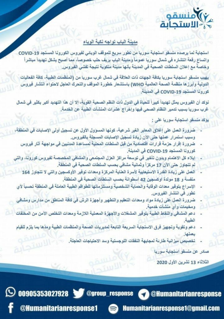 وأضاف: “تم الاستناد إلى أن مدينة الباب لا يوجد فيها مشافي مخصصة لعلاج حالات كوفيد- 19 ولا مراكز عزل ولا مراكز حجر صحي، بالإضافة إلى شح الأدوية حتى الأساسية منها، مثل سيتامول وبروفين والمضادات الحيوية البسيطة”.