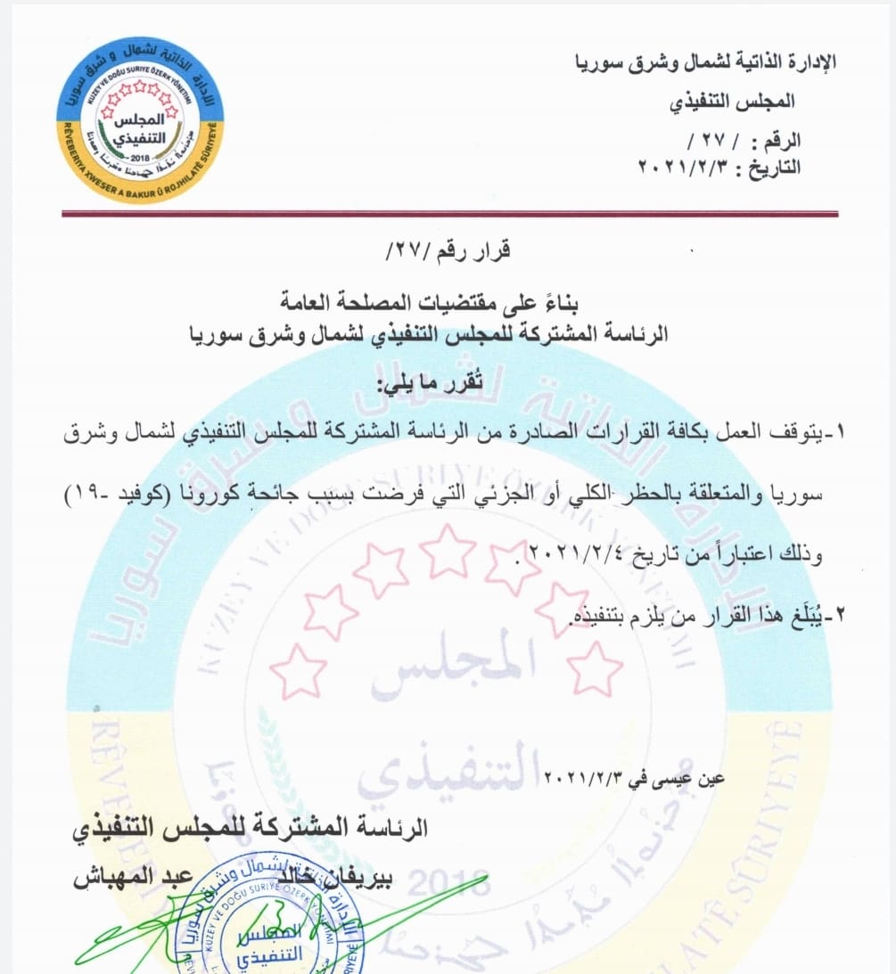 وأصدرت الإدراة بياناً عبر معرّفاتها الرسمية، اليوم الأربعاء، قالت فيه إن جميع القرارات الصادرة من الرئاسة المشتركة لشمال وشرق سورية والمتعلقة بالحظر الجزئي أو الكلي بسبب فيروس “كورونا”، سوف تتوقف عن العمل اعتباراً من تاريخ 4 فبراير/ شباط الجاري.