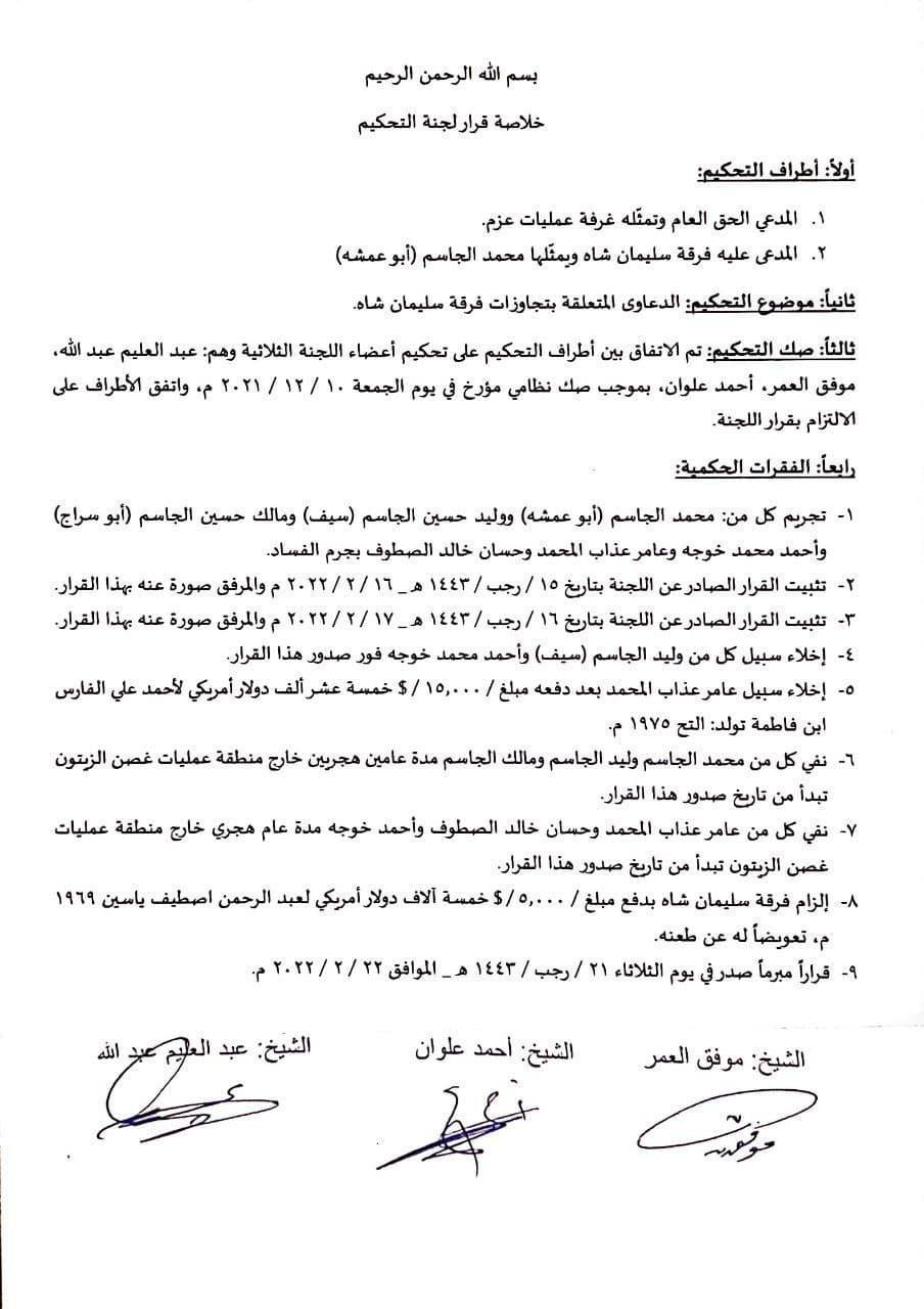 أصدرت لجنة التحكيم المكلفة بالتحقيق بانتهاكات “فرقة سليمان شاه”، قراراً ينص على نفي قائدها محمد الجاسم الملقب “أبو عمشة”، مدة عامين هجريين.