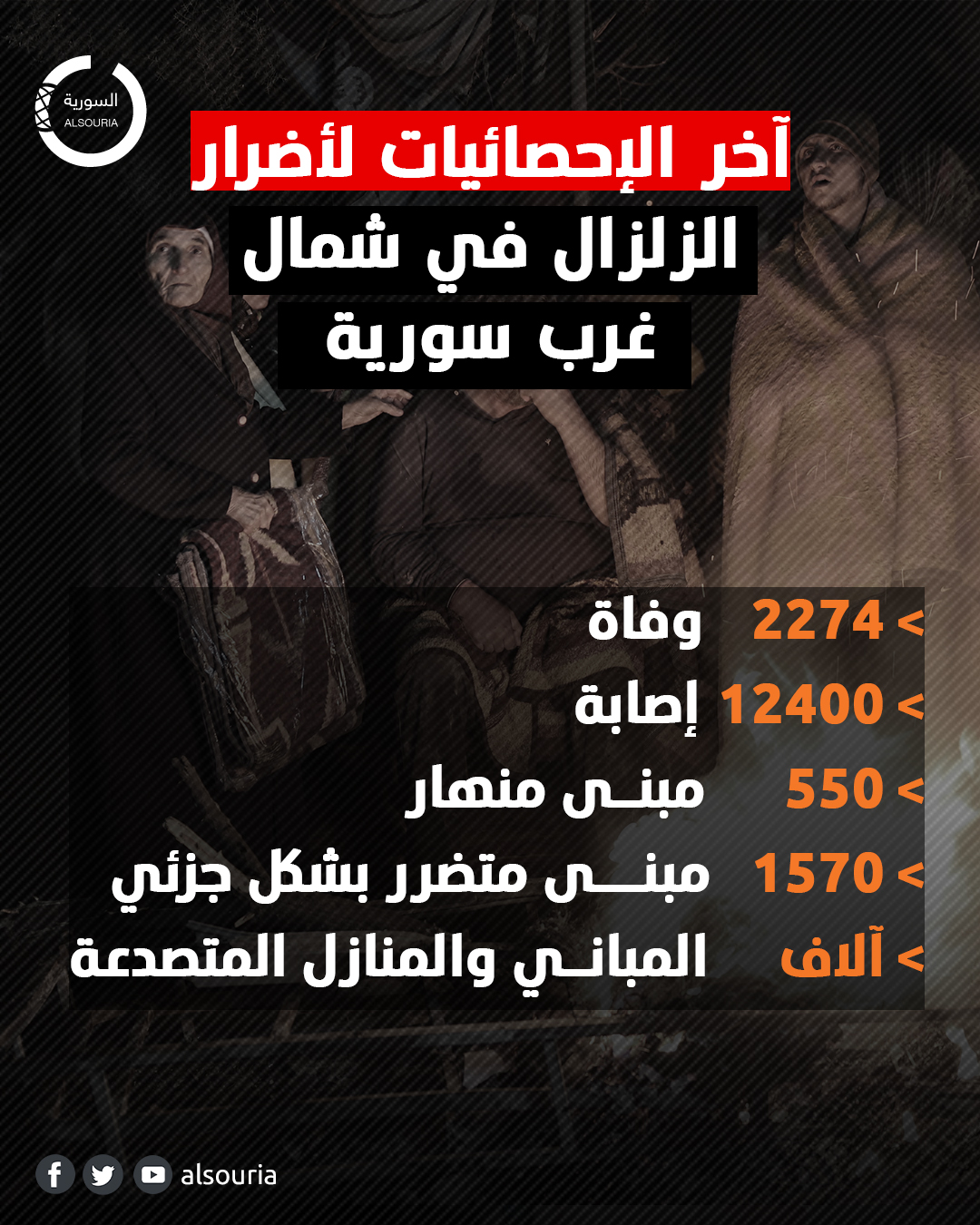 بعد مقاطعة البيانات.. عدد ضحايا الزلزال في شمال غربي سورية يرتفع إلى 2274 شخص في 15/02/2023 مشاركة المصدر السورية.نت إحصائيةالدفاع المدنيتركيازلزالسوريةشمال غربي سورياضحايا مشاركة