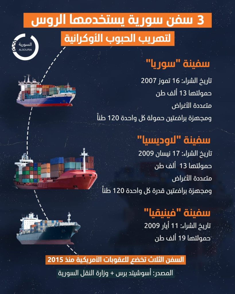 نقل النظام السوري أكثر من 500 ألف طن من القمح من ميناء سيفاستوبول في شبه جزيرة القرم التي ضمتّها روسيا من أوكرانيا إلى سورية، وذلك خلال العام الجاري، وبواسطة 3 سفن تتبع له خاضعة للعقوبات الأمريكية.