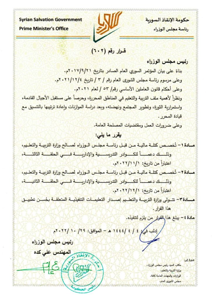 وأعلنت حسابات مقرّبة من “تحرير الشام”، عن خطّة تموّلها الأخيرة لمواجهة “أزمة التعليم”، بمنحة مالية تدعم المدرّسين المتطوعين، على مرحلتين اثنتين، تشمل الحلقة الثانية والثالثة.