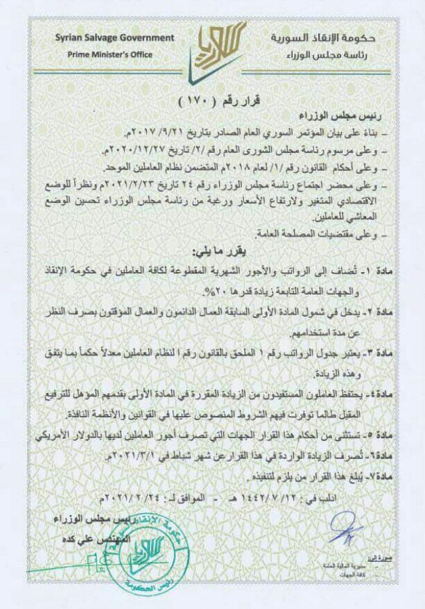 أعلنت “حكومة الإنقاذ”، التي تدير مع “هيئة تحرير الشام”، معظم مناطق محافظة إدلب، زيادة رواتب العاملين في المؤسسات التابعة لها، بنسبة 20%.